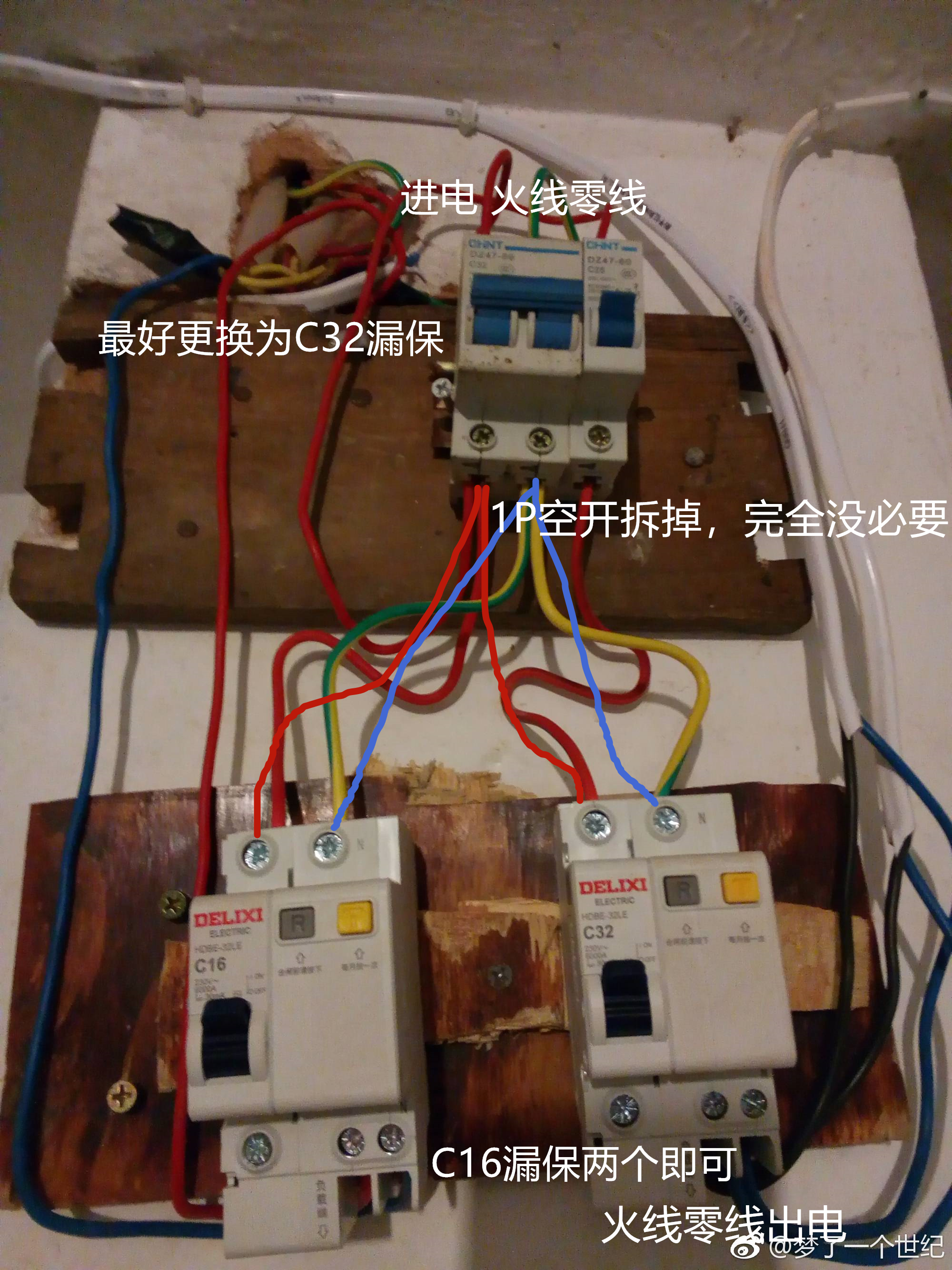 cs10086qq 发表于 2018-11-5 23:33 图片发给你,另外地线的线色别拿去当零线。严格上来讲不科学。1P空开拆掉。 你不改的话 大功率我估计肯定跳 ...